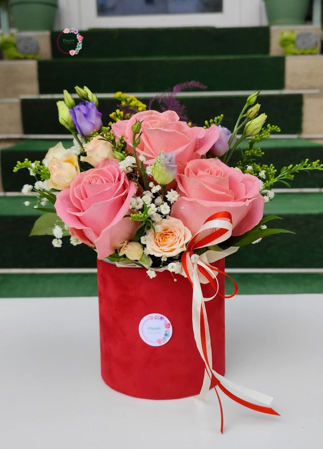 Un aranjament floral spectaculos, realizat într-o cutie catifelată (roșie sau albastră), ce combină frumusețea trandafirilor roz intens cu delicatețea lisianthusului mov, accentuat de mini-trandafiri crem, gypsophila și verdeață decorativă. Aranjamentul este înfrumusețat cu panglici elegante, oferind un plus de rafinament. Potrivit pentru aniversări, declarații romantice, cadouri elegante sau ocazii festive.