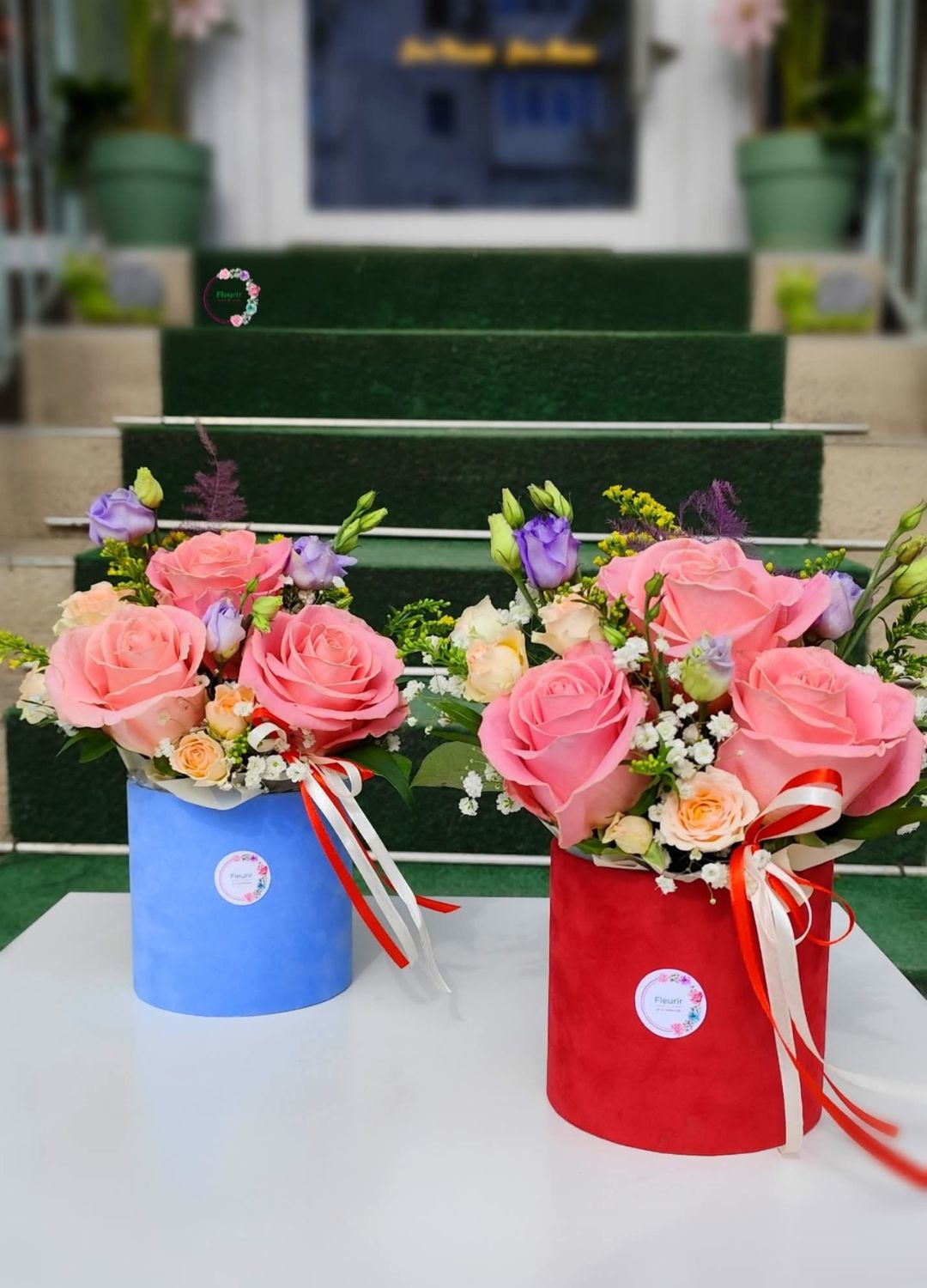 Fleurir Aranjament floral în cutie catifelată cu trandafiri roz și lisianthus mov