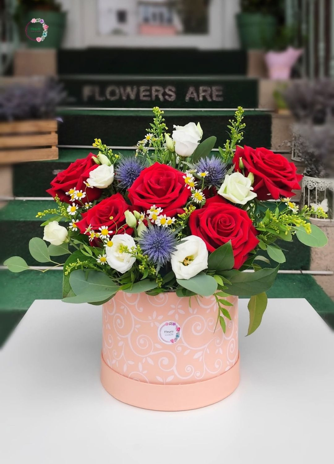 Un aranjament elegant și modern, realizat într-o cutie decorativă cu model delicat, ce îmbină frumusețea clasică a trandafirilor roșii cu rafinamentul lisianthusului alb și accentele inedite de eryngium bleu. Florile de câmp miniaturale și verdeața naturală adaugă un plus de prospețime și veselie. Acest aranjament este alegerea perfectă pentru a transmite iubire, recunoștință sau felicitări într-un mod sofisticat și memorabil.