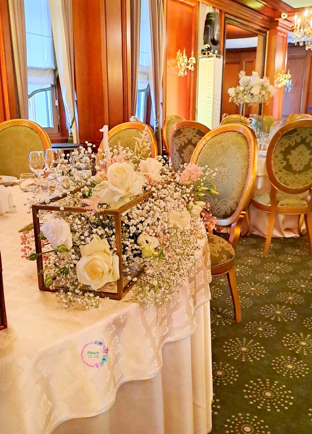 Un decor floral rafinat, conceput special pentru masa de prezidiu, ideal pentru a adăuga o notă de eleganță și romantism evenimentului tău. Aranjamentul este realizat într-o structură geometrică aurie, decorată cu trandafiri albi, lisianthus delicat și accente diafane de gypsophila, completate de nuanțe subtile de roz pal. Designul armonios și culorile pastelate creează o atmosferă caldă și sofisticată, perfectă pentru un eveniment memorabil.
