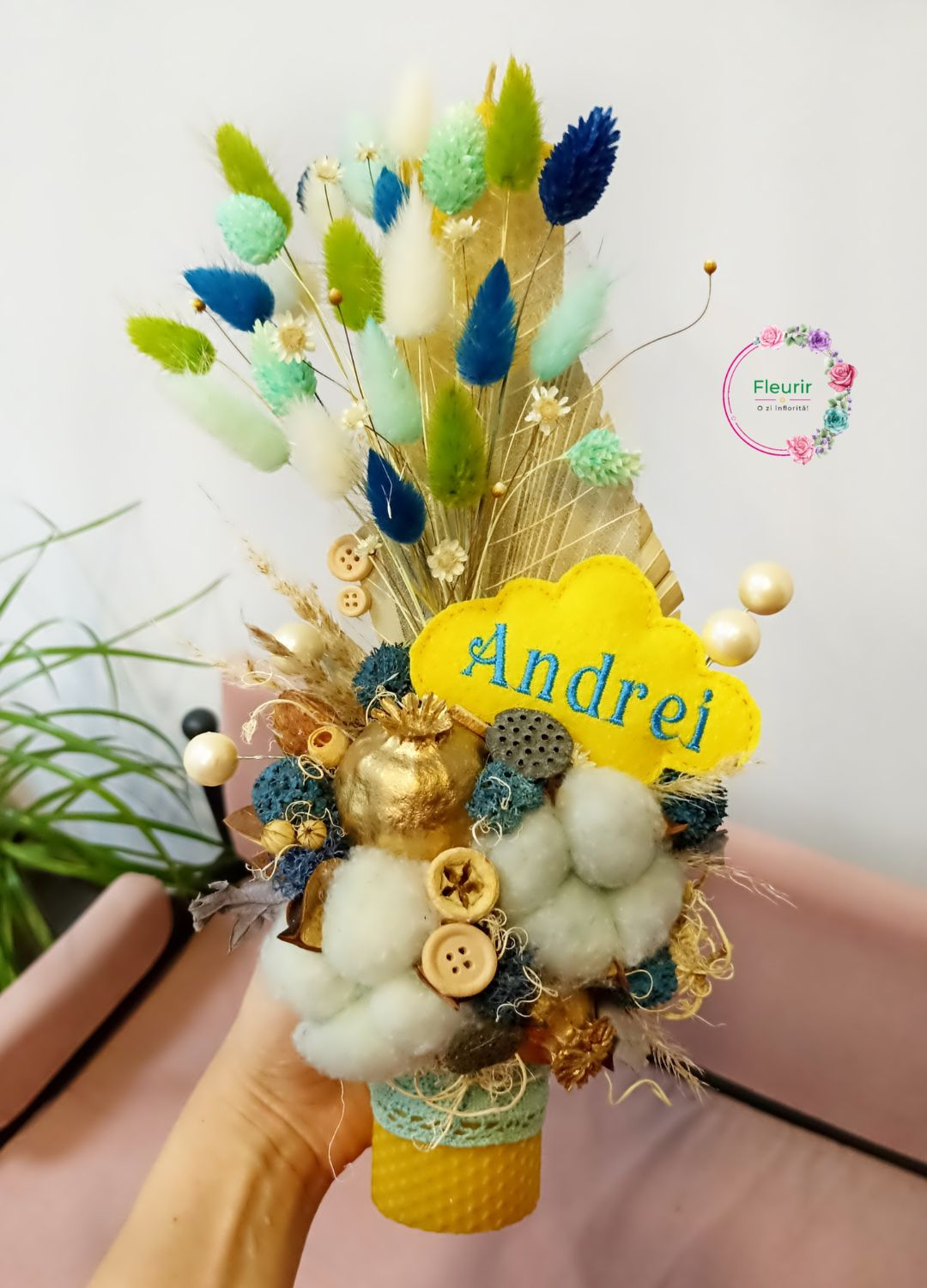 Această lumânare de botez este decorată cu detalii unice, precum flori uscate colorate în nuanțe de albastru și verde, completate de elemente aurii și detalii naturale din bumbac și butoni decorativi. Personalizată cu numele brodat pe un suport galben din fetru, această lumânare este perfectă pentru o ceremonie deosebită.