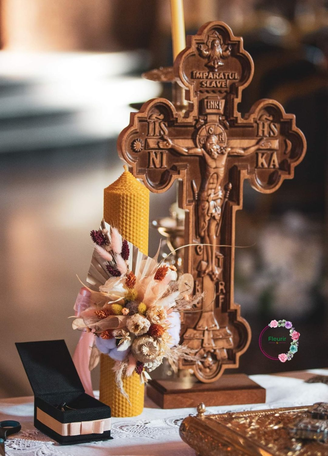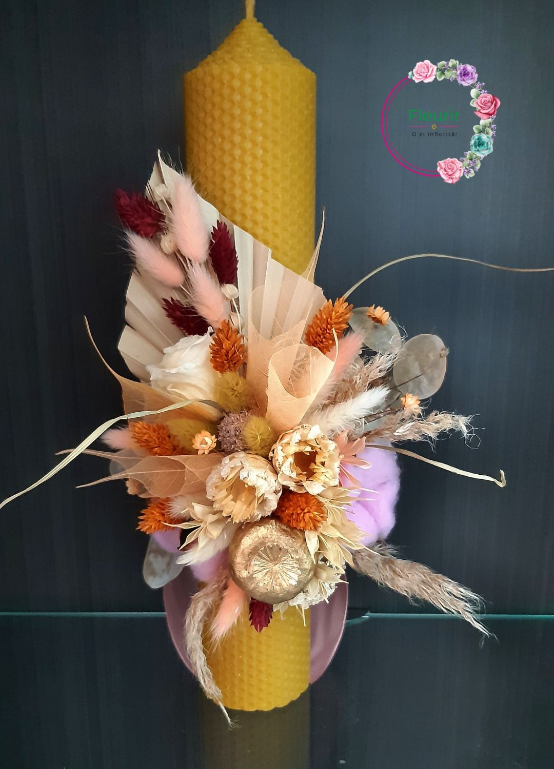 Această lumânare de botez este realizată din ceară naturală galbenă, având un design rustic și elegant, decorat cu flori uscate atent selecționate. Aranjamentul include elemente precum lagurus, floricele uscate în nuanțe pastel și accente aurii pentru un efect sofisticat. Fundalul este completat de frunze de palmier și detalii naturale, oferind o atmosferă boemă și rafinată. Ideală pentru un botez cu tematică rustică sau vintage.