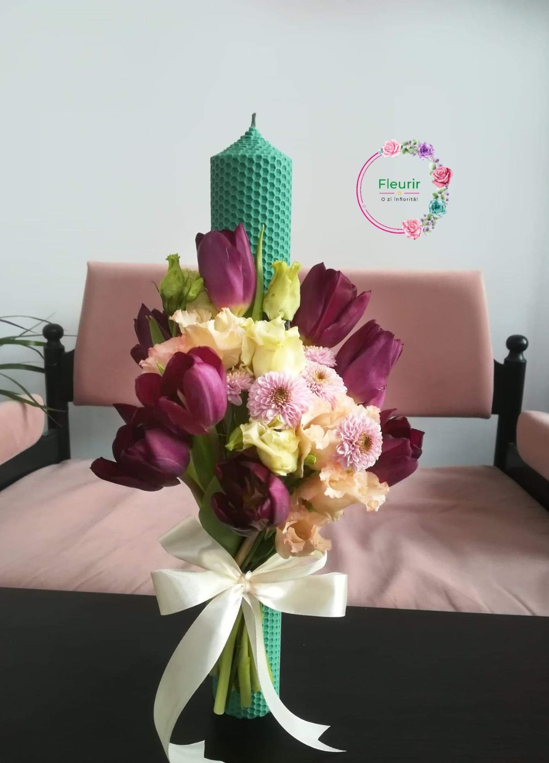 Conține: 9 lalele mov, lisianthus somon, crizanteme roz, panglică, lumânare din ceară naturală tip fagure verde.