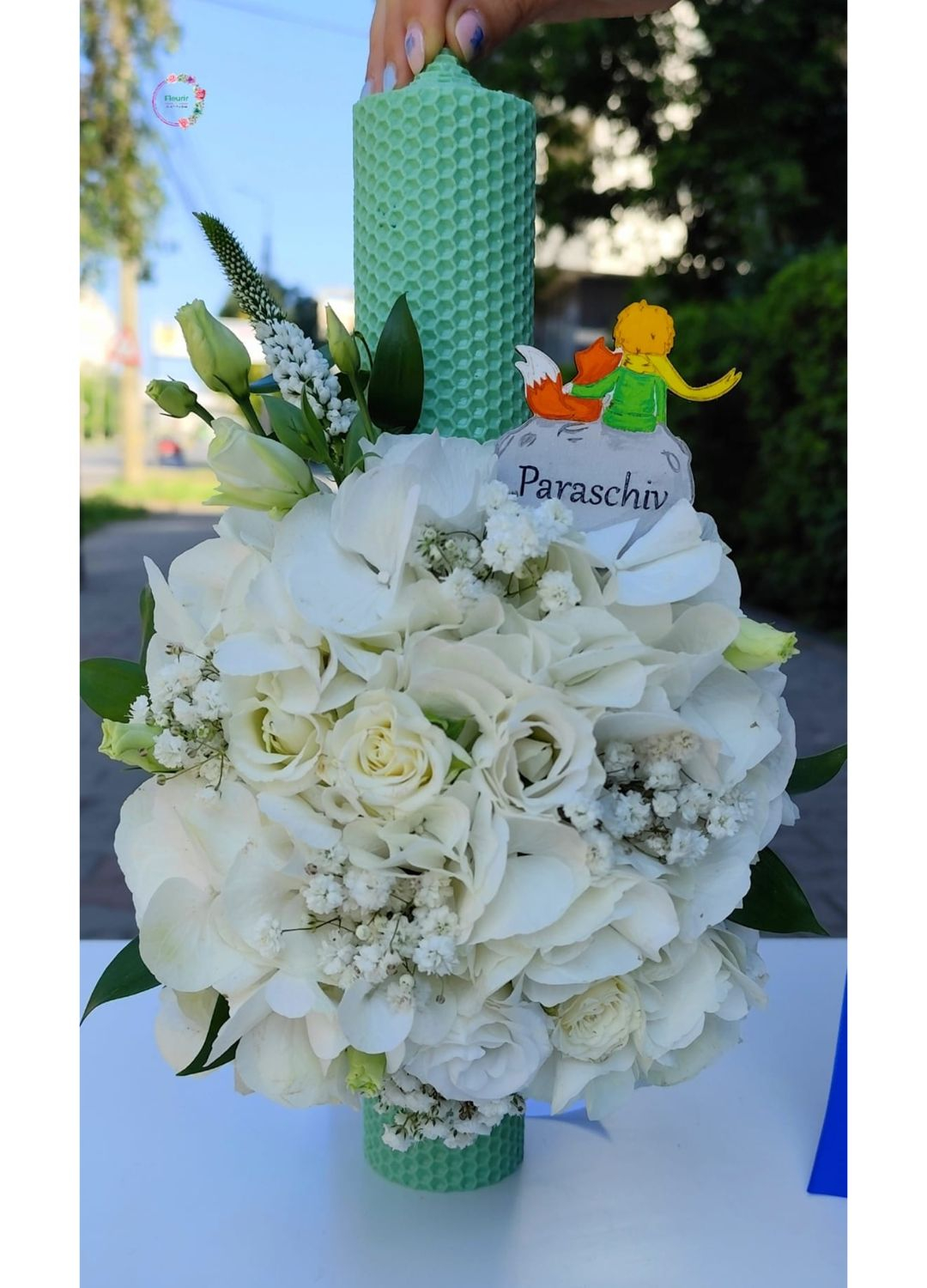 Conține: hortensie albă, miniroze albe, lisianthus alb, gypsophila, veronica, verdeață, personalizare „Micul Prinț”, panglică, lumânare din ceară naturală tip fagure verde deschis.