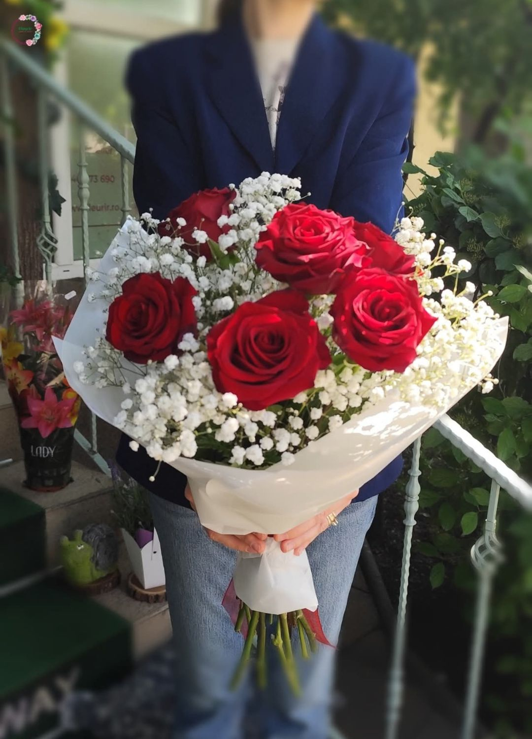 Conține: 7 trandafiri roșii, gypsophila albă, verdeață proaspătă, ambalaj, panglică.