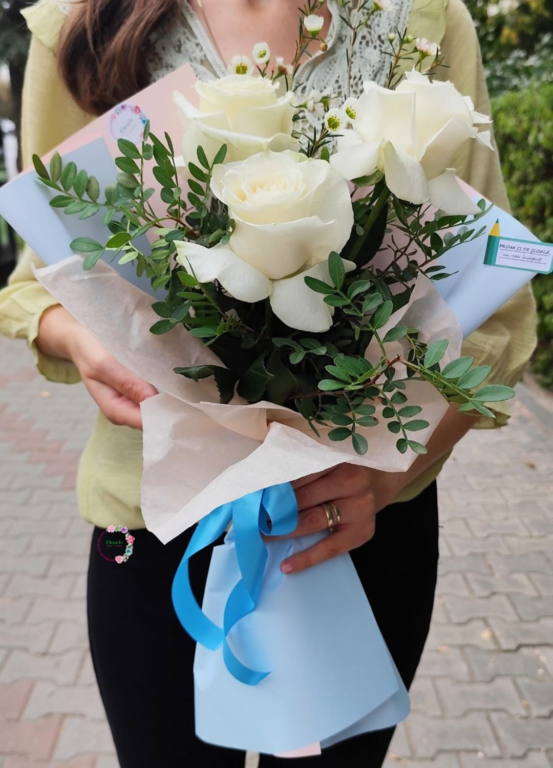 Buchet elegant cu trandafiri albi, acompaniat de gypsophila sau alte flori albe, sunt aranjate cu grijă și accentuate de verdeață proaspătă. Fiecare buchet este ambalat în hârtie de calitate și decorat cu panglici asortate, oferind un aspect sofisticat și atrăgător. Aceste aranjamente sunt perfecte pentru a celebra momente speciale precum aniversări, zile de naștere, evenimente romantice sau alte ocazii importante.