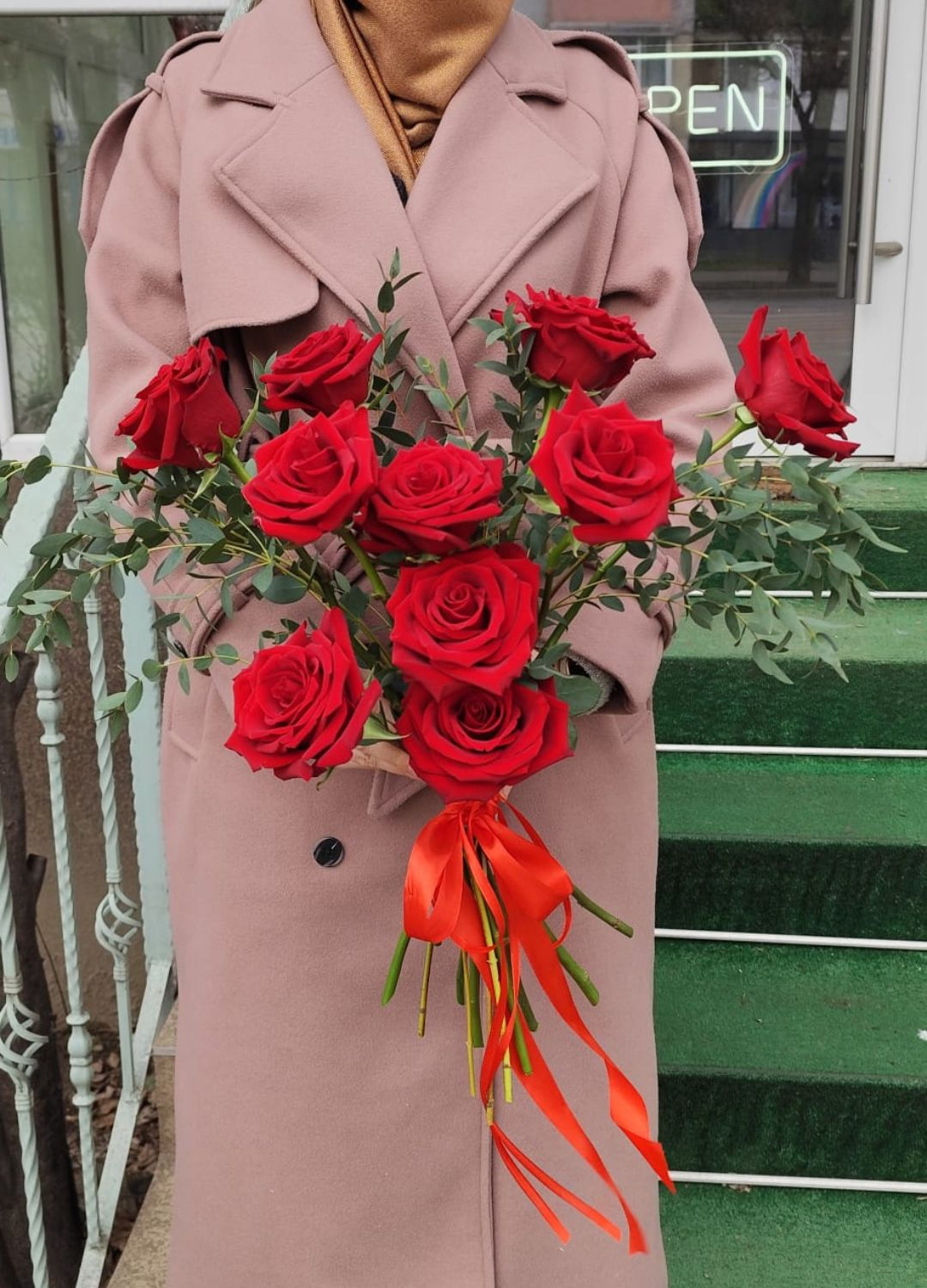 Conține: 11 trandafiri roșii, eucalipt, o panglica roșie.