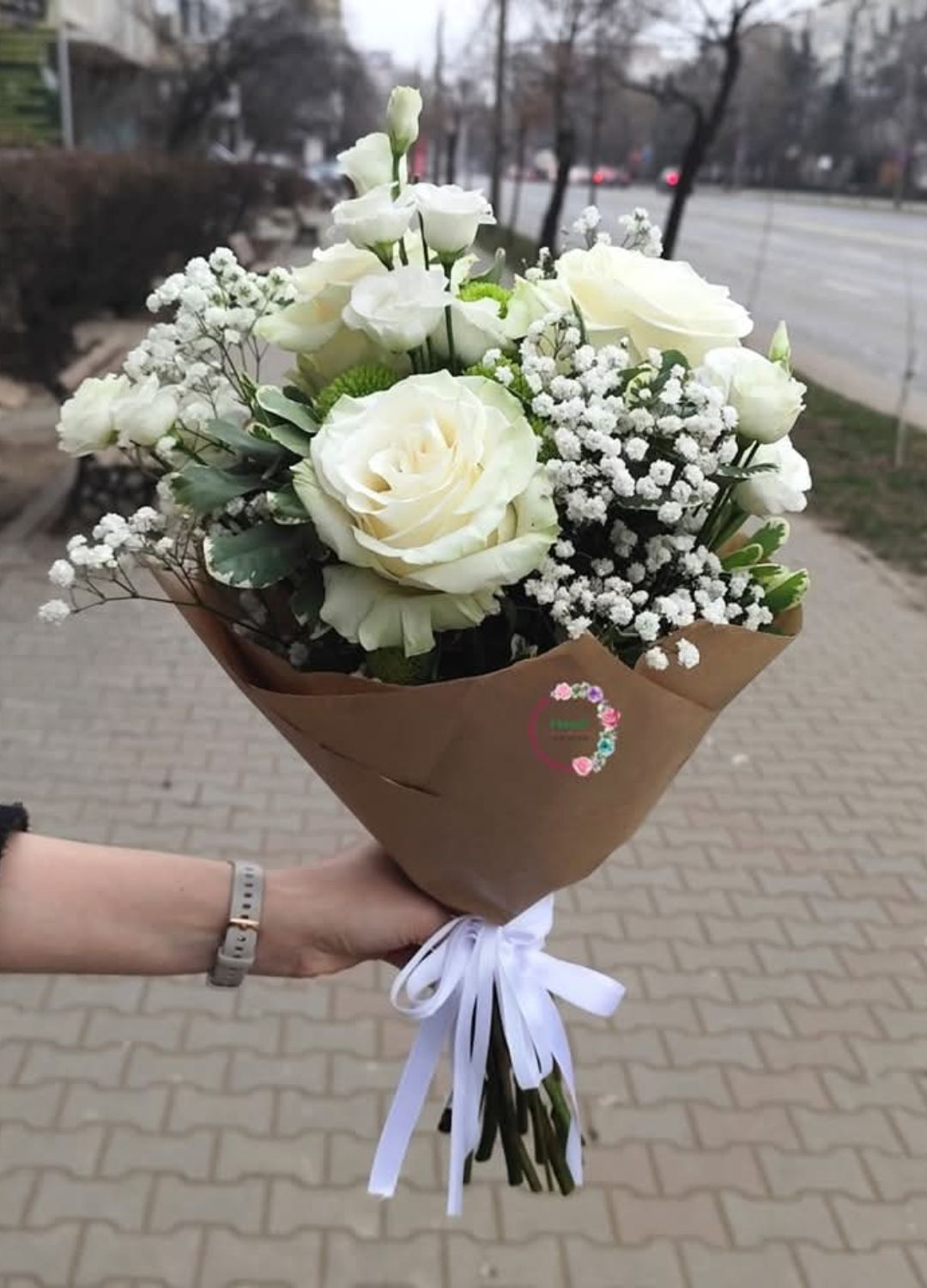 Un buchet elegant și rafinat, realizat din trandafiri albi proaspeți, lisianthus delicat și gypsophila diafană, completat de frunze verzi pentru un contrast subtil. Ambalat în hârtie kraft naturală și legat cu panglică albă, acest aranjament este perfect pentru ocazii speciale precum nunți, botezuri, aniversări sau momente romantice. Albul pur simbolizează sinceritatea și eleganța, transformând acest buchet într-un cadou memorabil pentru cei dragi.