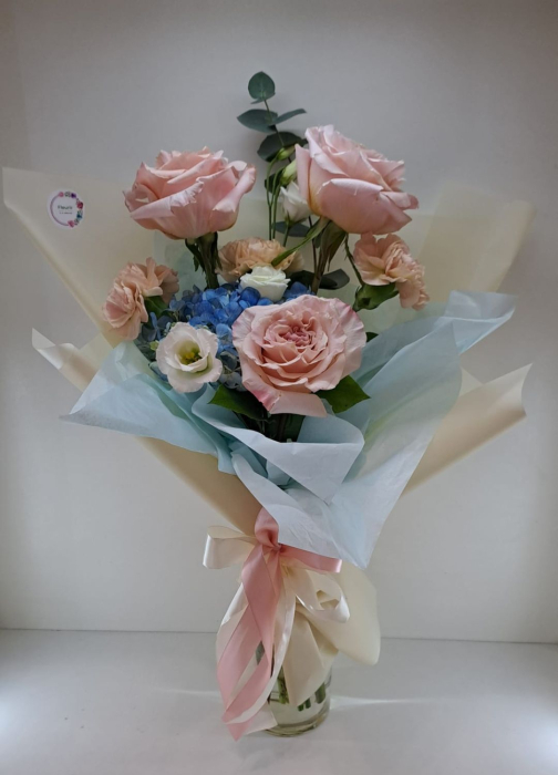 Poate conține: trandafiri / miniroze / lisianthus / gypsophila / flori de sezon / alte flori disponibile in stoc, verdeață, ambalaj, panglica.Suport clienti Lasati-ne un mesaj pe Messenger sau Whatsapp si vom raspunde in cel mai scurt timp posibil.