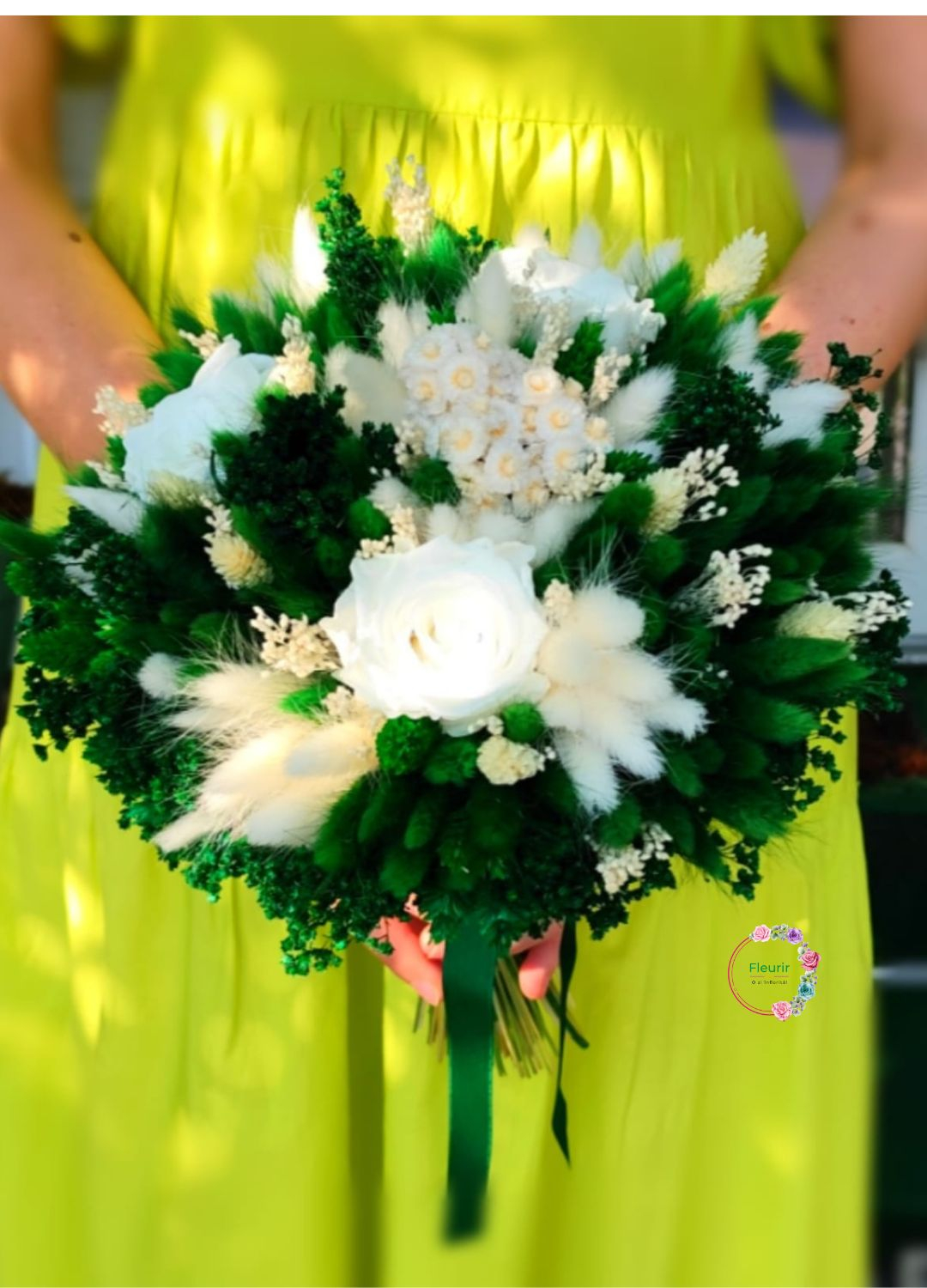 Un buchet exclusivist și elegant, creat din trandafiri albi criogenați, însoțiți de flori uscate și accente verzi stabilizate. Trandafirii criogenați păstrează frumusețea și prospețimea naturală pentru o perioadă îndelungată, transformând acest buchet într-un simbol al iubirii eterne. Combinația de alb și verde aduce rafinament, naturalețe și un aer atemporal, perfect pentru o mireasă care își dorește un buchet unic și deosebit.