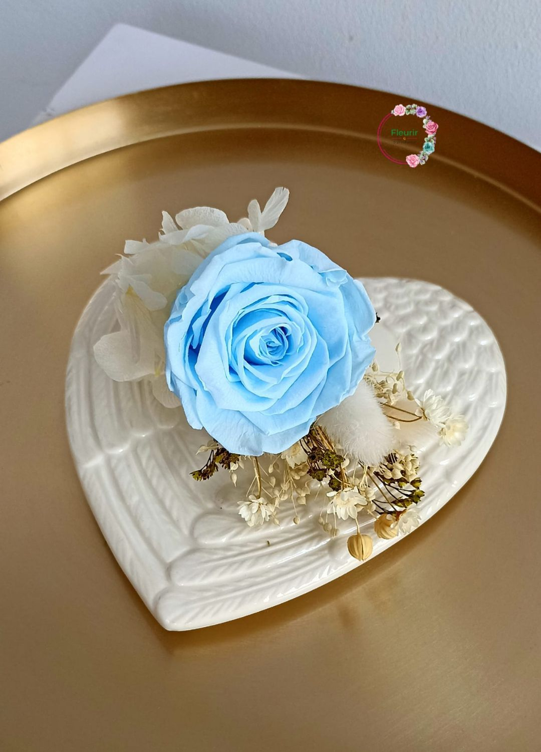Această cocardă elegantă combină un trandafir criogenat albastru deschis cu accente delicate de flori naturale uscate, creând un design rafinat și modern. Perfectă pentru mire, nași sau invitați speciali, această cocardă adaugă un aer distinctiv și sofisticat oricărui costum de ceremonie. Este ideală pentru evenimente elegante, precum nunți sau botezuri.