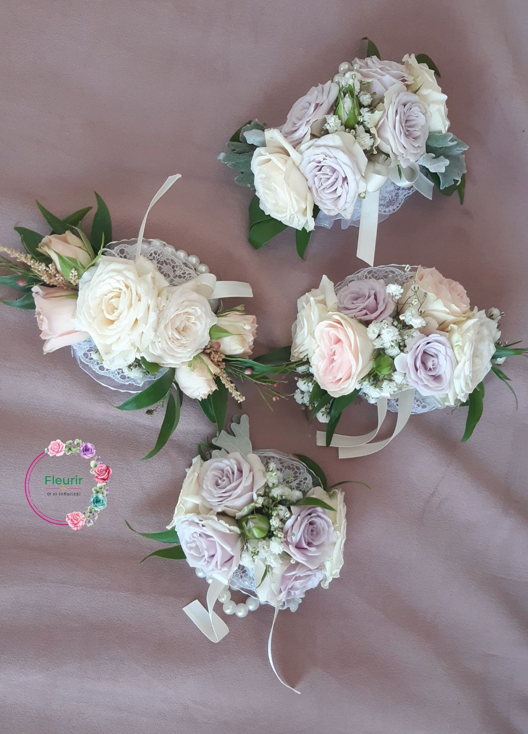 Aceste corsaje florale elegante sunt realizate din miniroze în nuanțe delicate de alb, roz pal și lila, completate de gipsofila albă și frunziș verde natural. Decorate cu panglici fine și dantelă albă, aceste accesorii aduc un plus de rafinament oricărui eveniment special. Perfecte pentru domnișoare de onoare, mame sau alte persoane dragi.