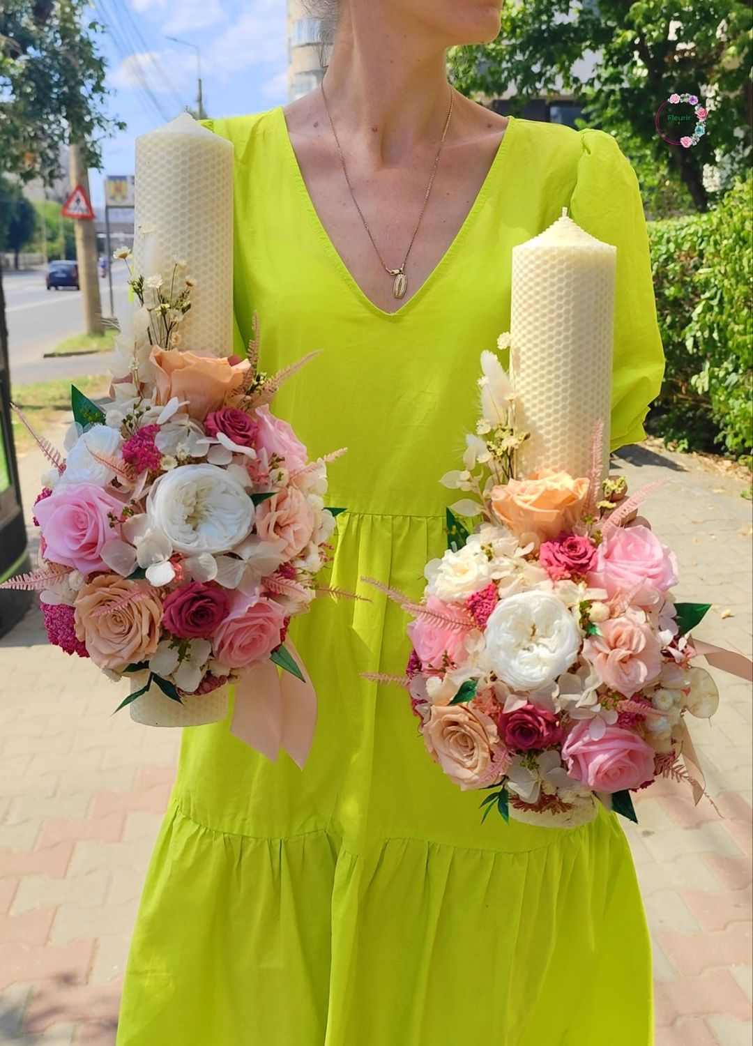Aceste lumânări de cununie sunt confecționate din ceară naturală, decorate cu aranjamente florale criogenate, romantice și delicate. Buchetele sunt realizate din trandafiri în nuanțe de roz, crem și alb, completate cu flori uscate și frunze delicate, totul legat cu o panglică de satin elegantă. Designul rafinat și paleta de culori pastelate le fac ideale pentru o cununie cu un aer sofisticat și elegant.