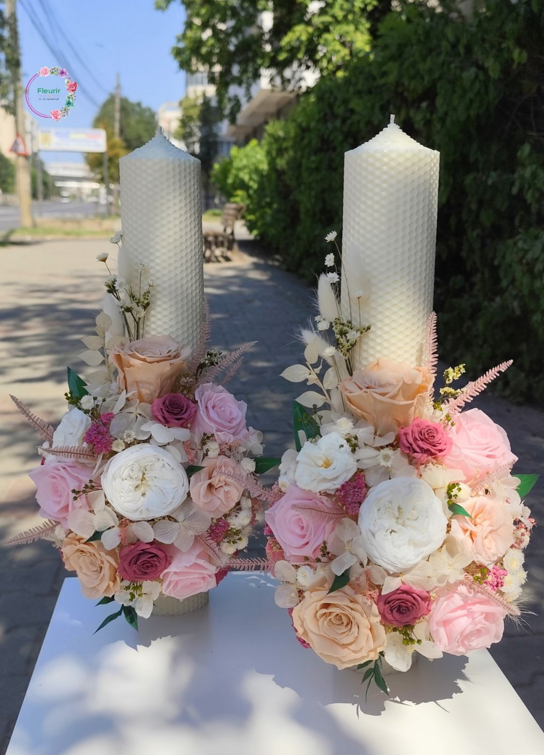 Lumânări de cununie realizate din ceară naturală și decorate cu flori criogenate și uscate în nuanțe pastelate, pentru un decor elegant și romantic.