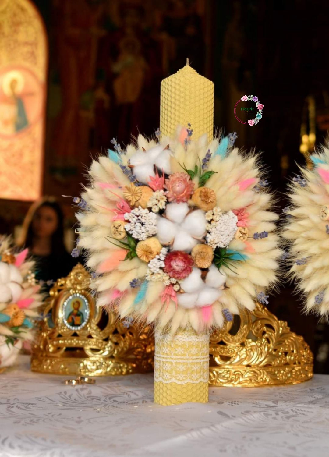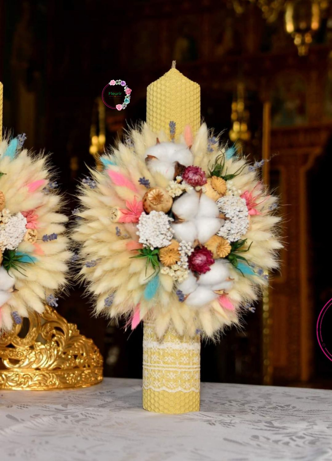 Aceste lumânări de cununie sunt confecționate din ceară naturală tip fagure, decorate cu aranjamente florale unice ce combină lagurus, flori de bumbac, lavandă și flori uscate în nuanțe pastelate. Fiecare lumânare este înfrumusețată cu panglici de dantelă, oferind un aer delicat și tradițional. Designul lor se potrivește perfect unei ceremonii elegante și rafinate.