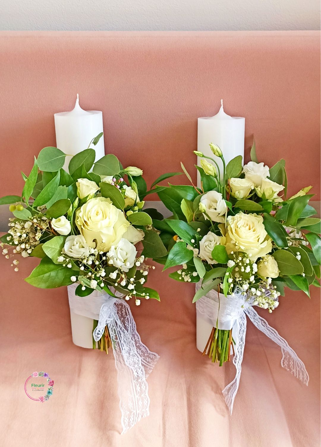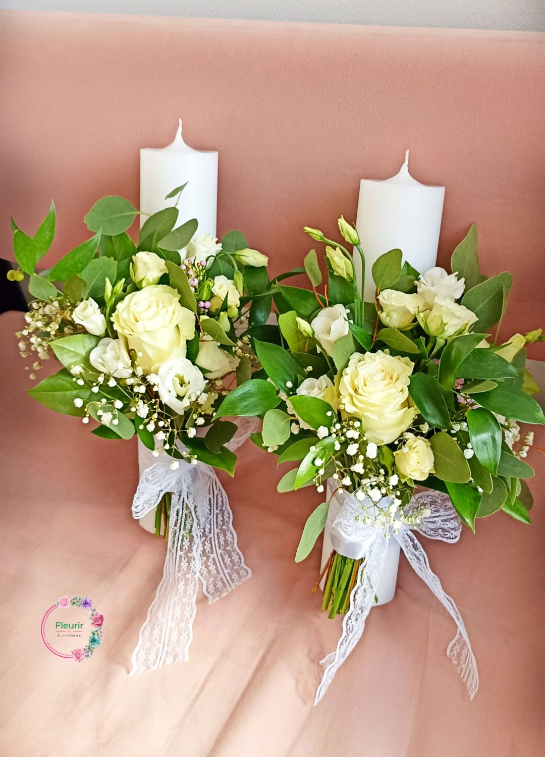 Setul de lumânări pentru cununie este realizat din parafină albă și decorat cu aranjamente florale elegante. Buchetele includ trandafiri albi, lisianthus și gypsophila, completate de frunze verzi naturale. Fiecare lumânare este accesorizată cu o panglică din dantelă albă, oferind un aspect rafinat și romantic, ideal pentru o ceremonie de nuntă clasică și sofisticată.