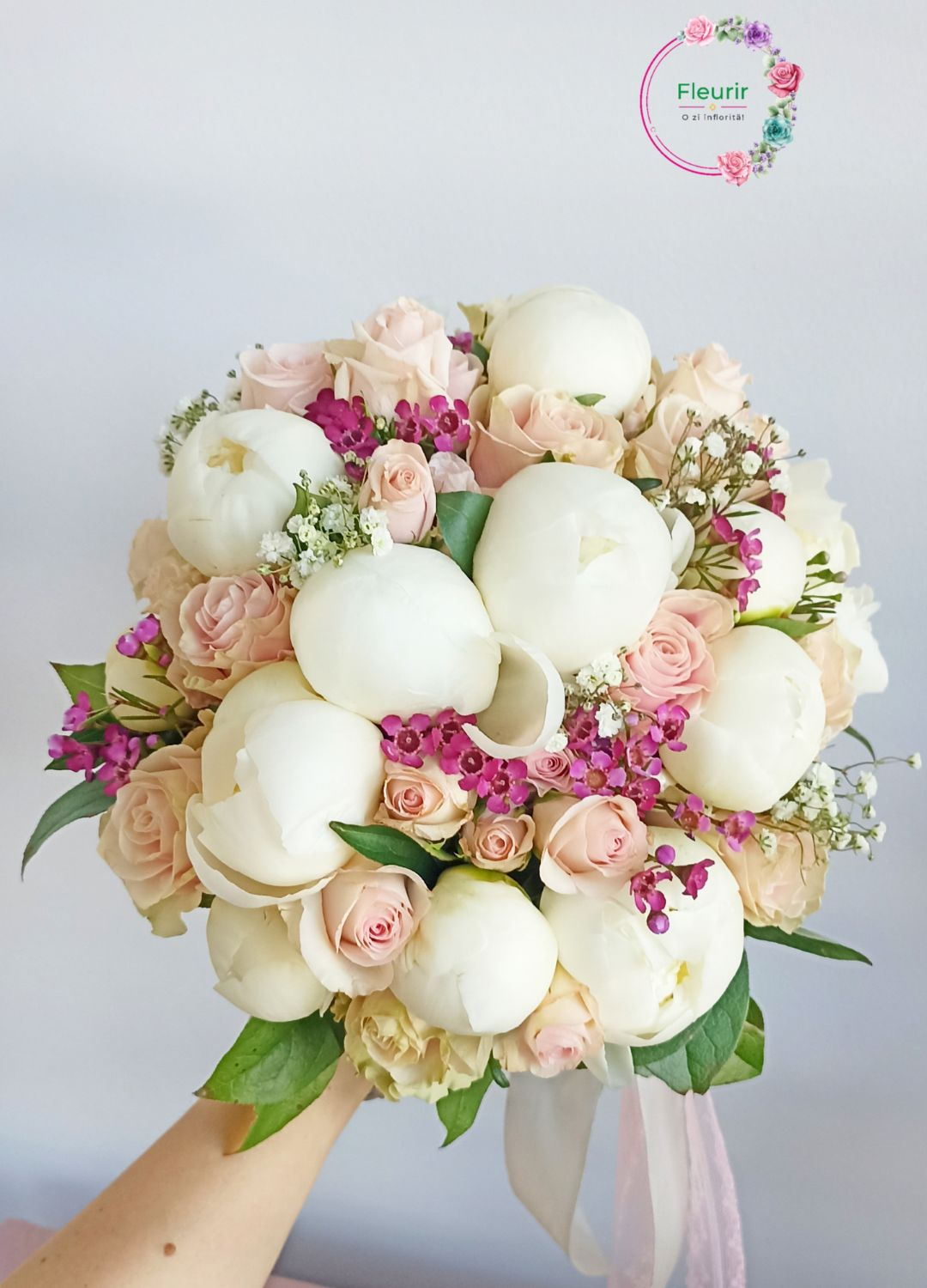 Un buchet de mireasă sofisticat, realizat din bujori albi parfumați, trandafiri roz pal și accente delicate de wax flower. Această combinație florală excepțională conferă buchetului un aspect diafan, romantic și elegant. Nuanțele pastelate și textura catifelată a bujorilor îl fac alegerea ideală pentru o mireasă care își dorește un accesoriu floral rafinat, potrivit atât pentru nunți clasice, cât și pentru cele cu tematică boho-chic. Finisat cu panglici vaporoase, acest buchet adaugă un plus de grație și feminitate întregului look nupțial.