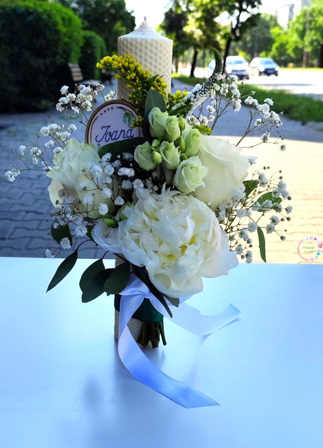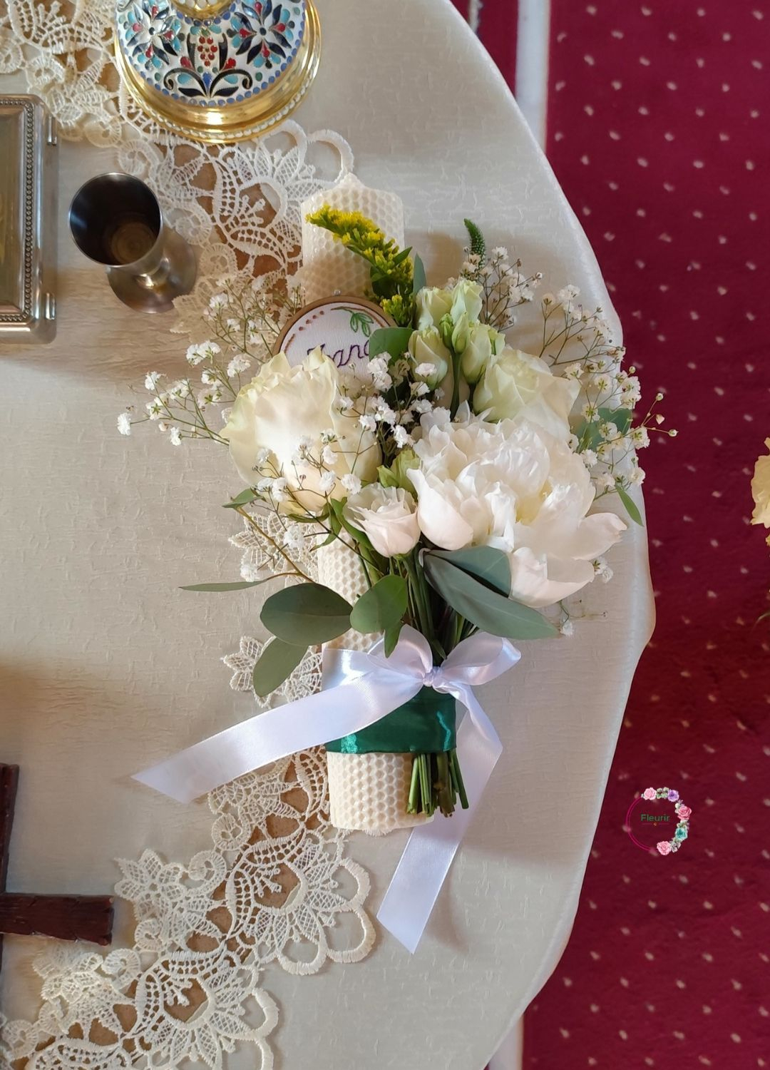 Conține: 1 bujor alb, 2 trandafiri albi, lisianthus alb, gypsophila, solidago, veronica, eucalipt, panglică, lumânare din ceară naturală tip fagure albă, personalizare.