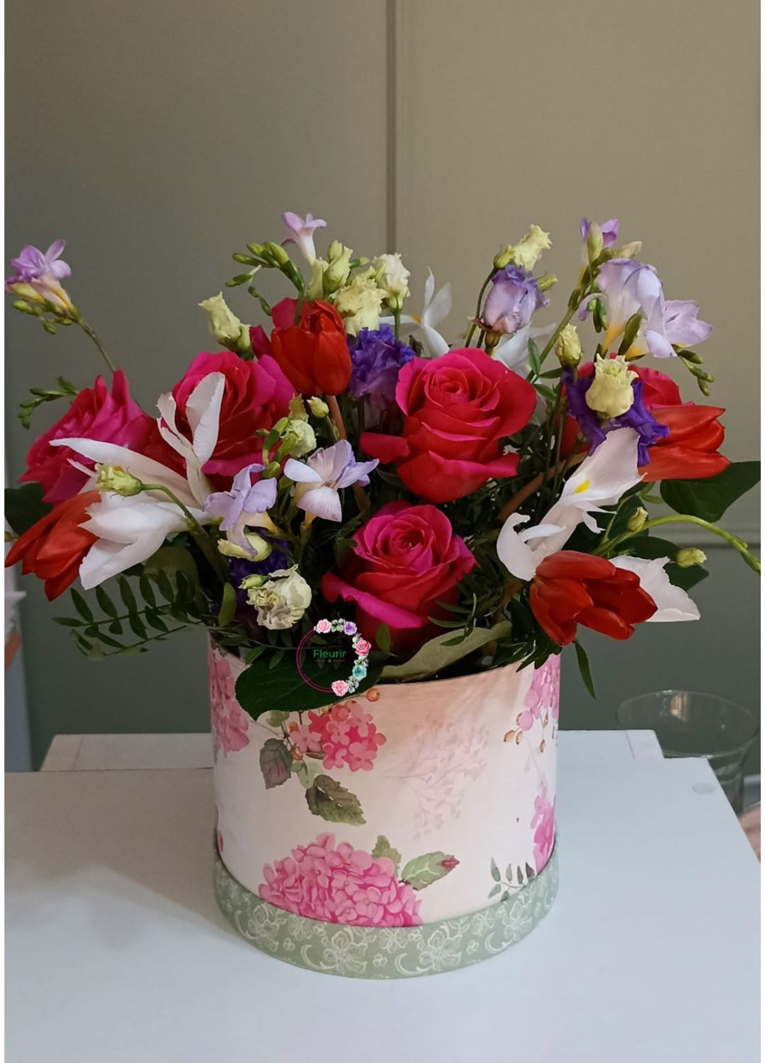 Conține: 5 trandafiri fucsia, 4 lalele roșii, 3 iriși albi, 3 frezii, lisiantuhus, verdeață, cutie cu imprimeu floral.
