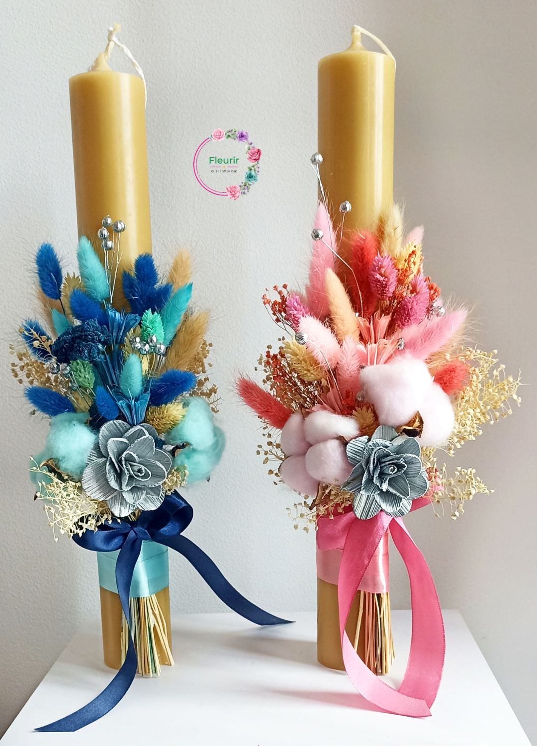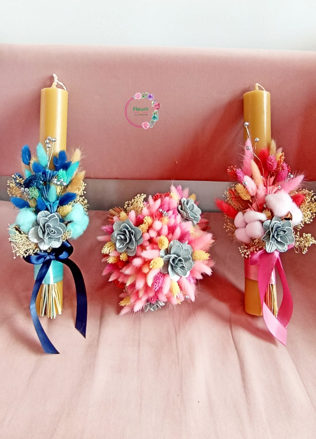 Aceste lumânări de cununie sunt realizate din ceară naturală de albine, cu un design contemporan și vibrant. Decorul floral este compus din flori uscate în nuanțe de albastru și roz, cu accente de bumbac, lagurus, phalaris și detalii metalice strălucitoare. Fiecare lumânare este completată cu panglici de satin în culori complementare, pentru un aspect elegant și modern, potrivit unei ceremonii pline de personalitate.