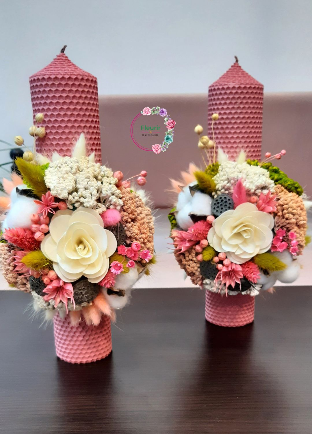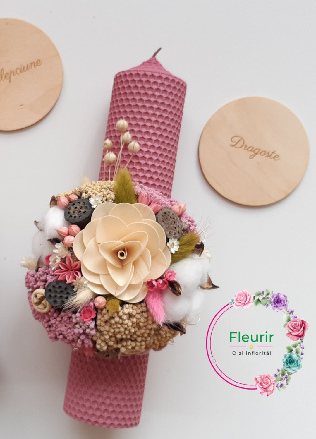 Lumânare de botez roz, cu flori din lemn, bumbac și elemente naturale uscate, pentru un eveniment plin de rafinament.