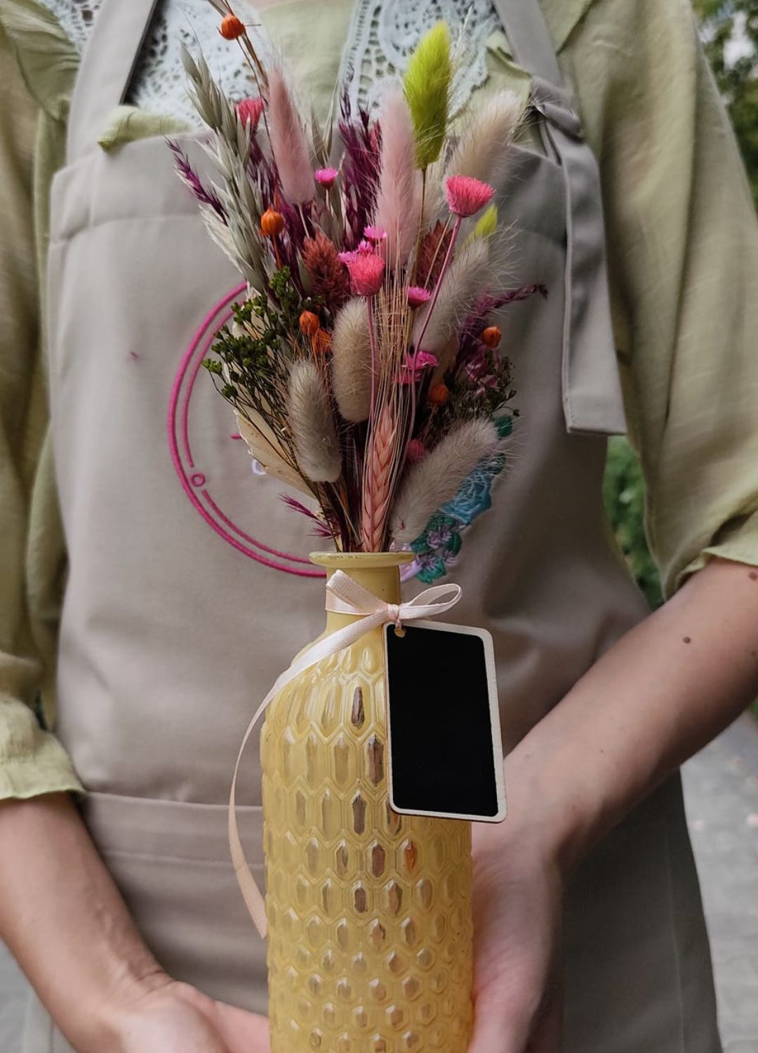 Acest aranjament elegant de flori uscate într-o vază texturată galbenă aduce o notă boemă și naturală în orice spațiu. Combinând elemente naturale în nuanțe delicate de roz, mov și verde, aranjamentul este o piesă decorativă ce exprimă rafinament și simplitate. Perfect pentru a adăuga un accent de culoare subtil și sofisticat într-o cameră de zi sau birou.